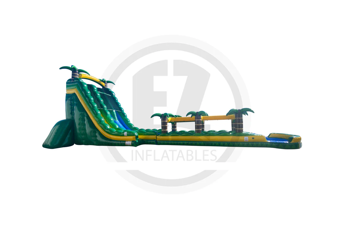 30 Ft Tropical Rush + Slip & Slide EZ Inflatables Water Slide. It’s a perfect option for any event where folks want to cool off and have some adrenaline pumping fun. Dimensions: 73'x23'x30', stakes, transportation bag. 1 year limited warranty